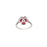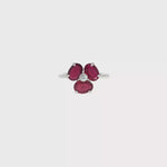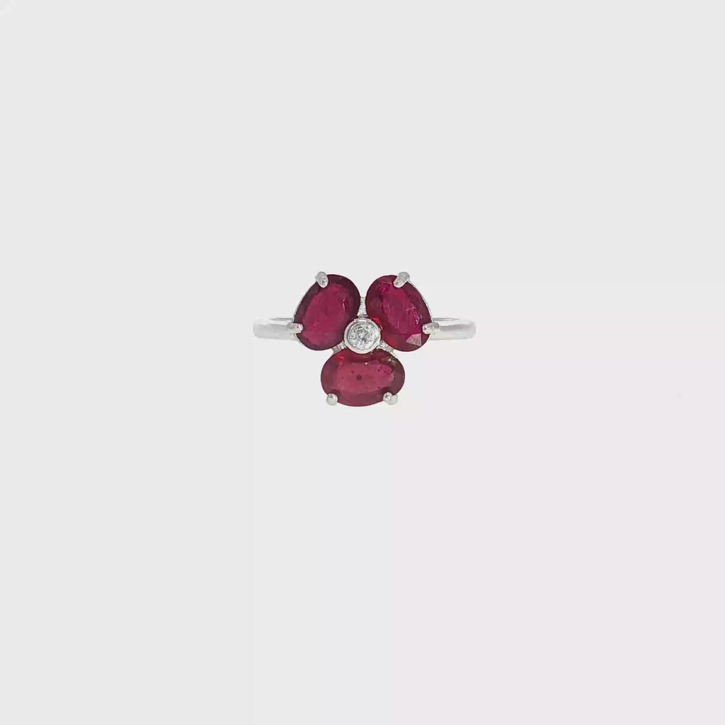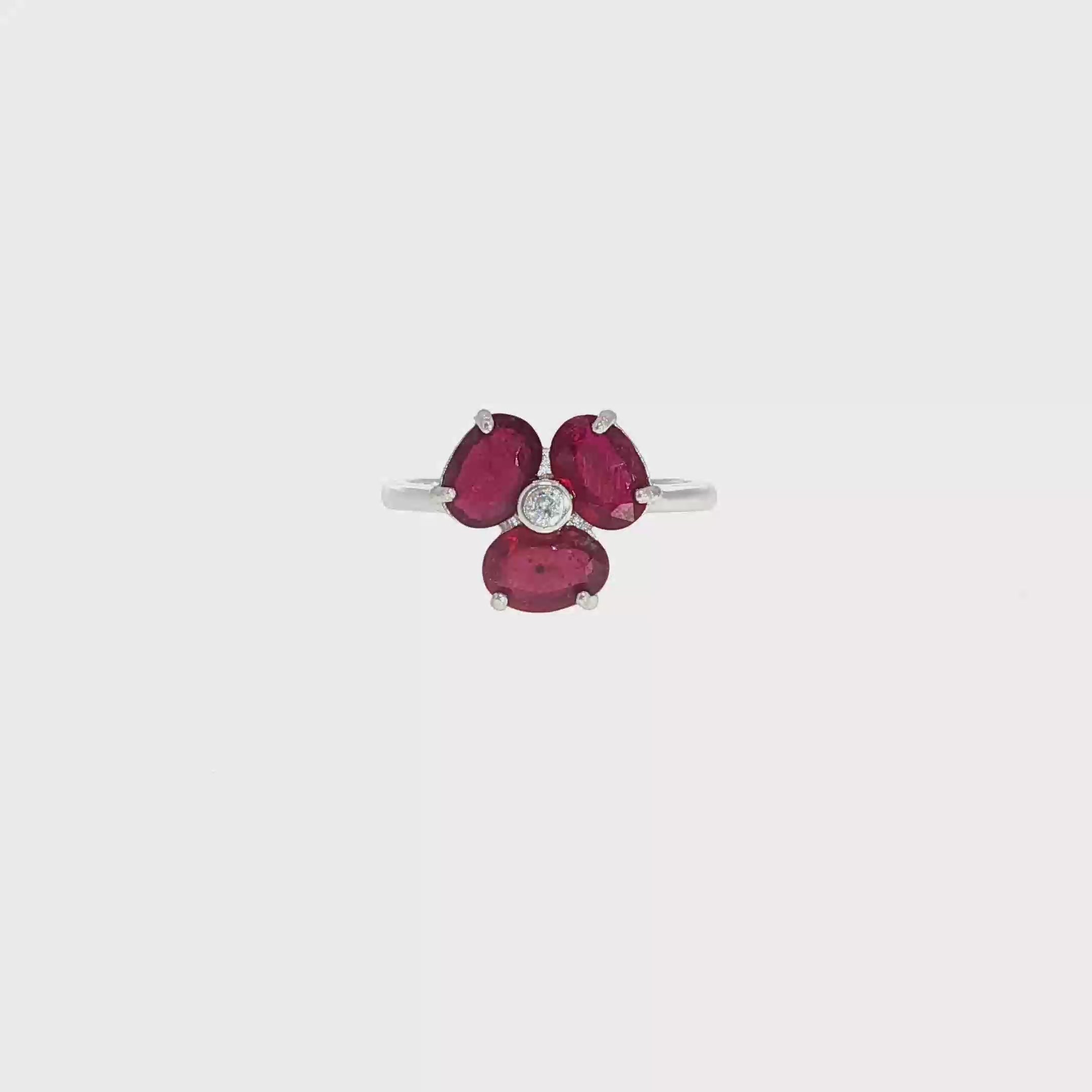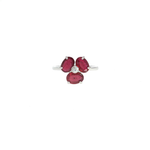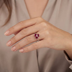 Au cœur de la composition, un zirconium délicatement serti apporte une touche de lumière et de contraste, soulignant l’éclat naturel des rubis qui l’entourent. L’agencement trilogie confère à cette bague une présence affirmée tout en conservant finesse et élégance.