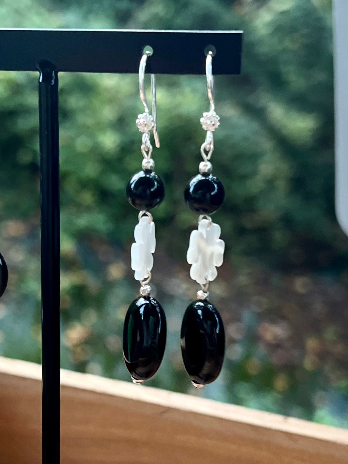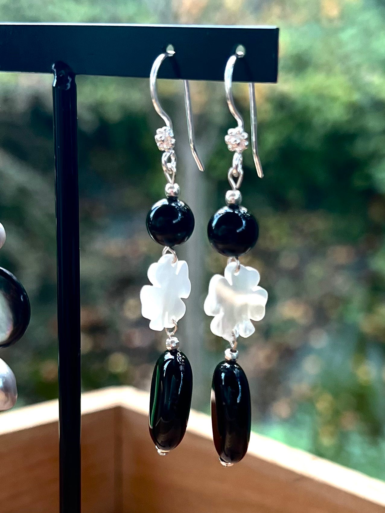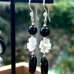 • Boucles d'oreilles en agate noire avec fleur en nacre blanche