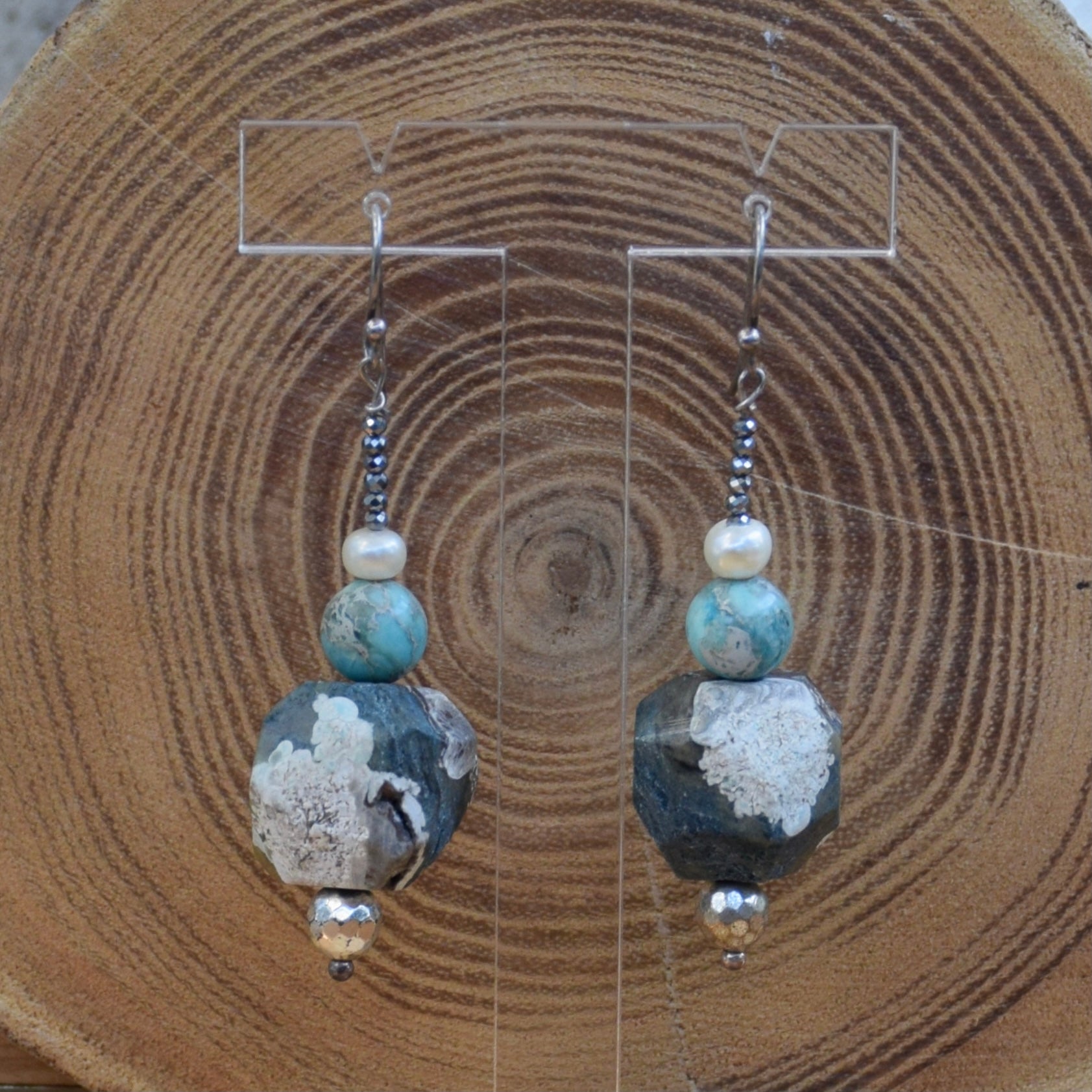 Boucles d'oreilles Océan, monté sur de l'argent 925/1000, avec pierres naturelles en agate avec nacre.