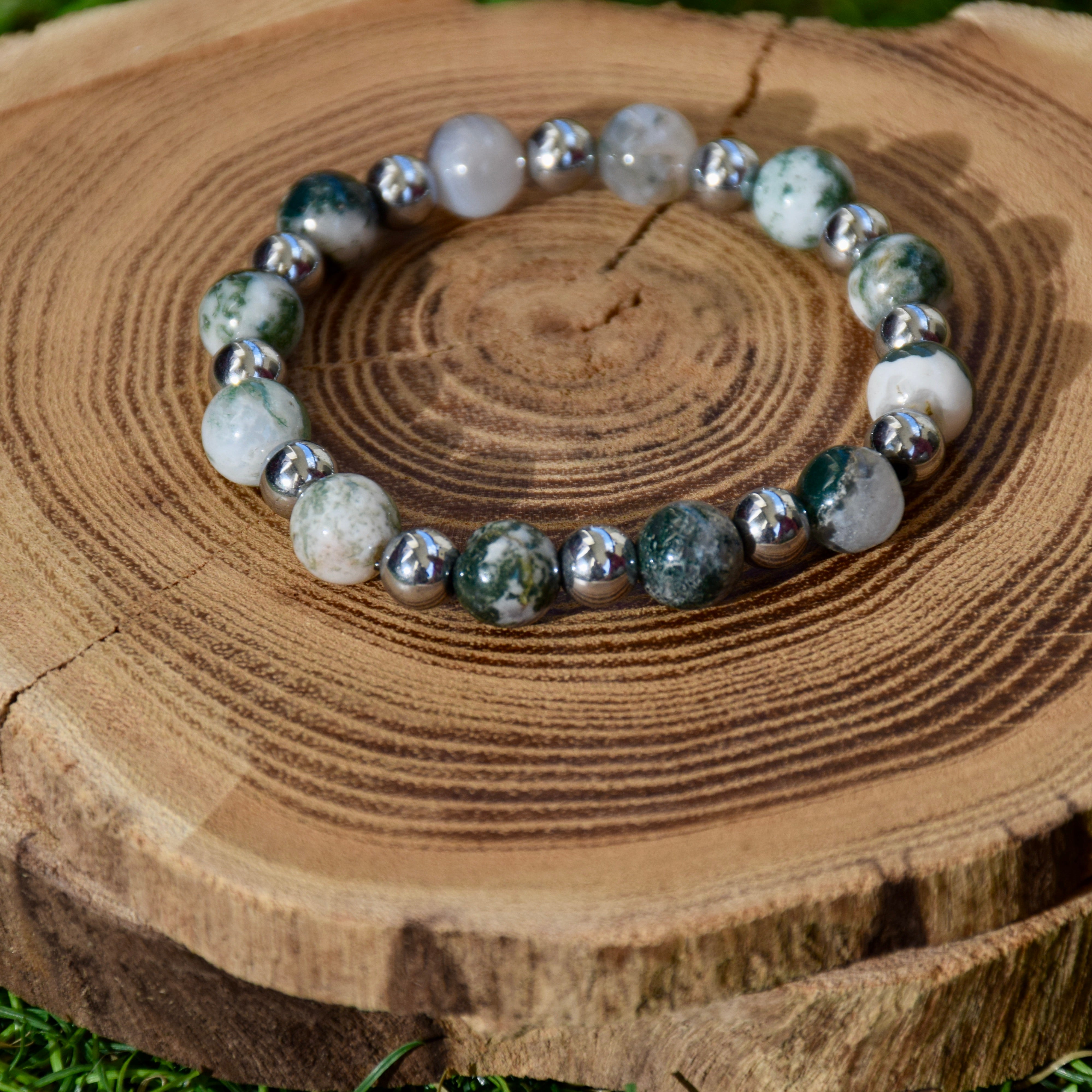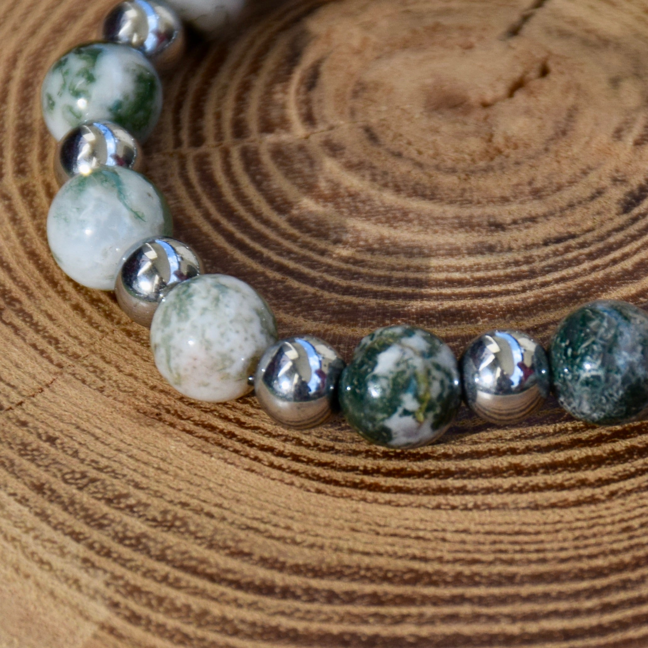 Bracelet d'agate tree/ mousse verte et hématite argenté