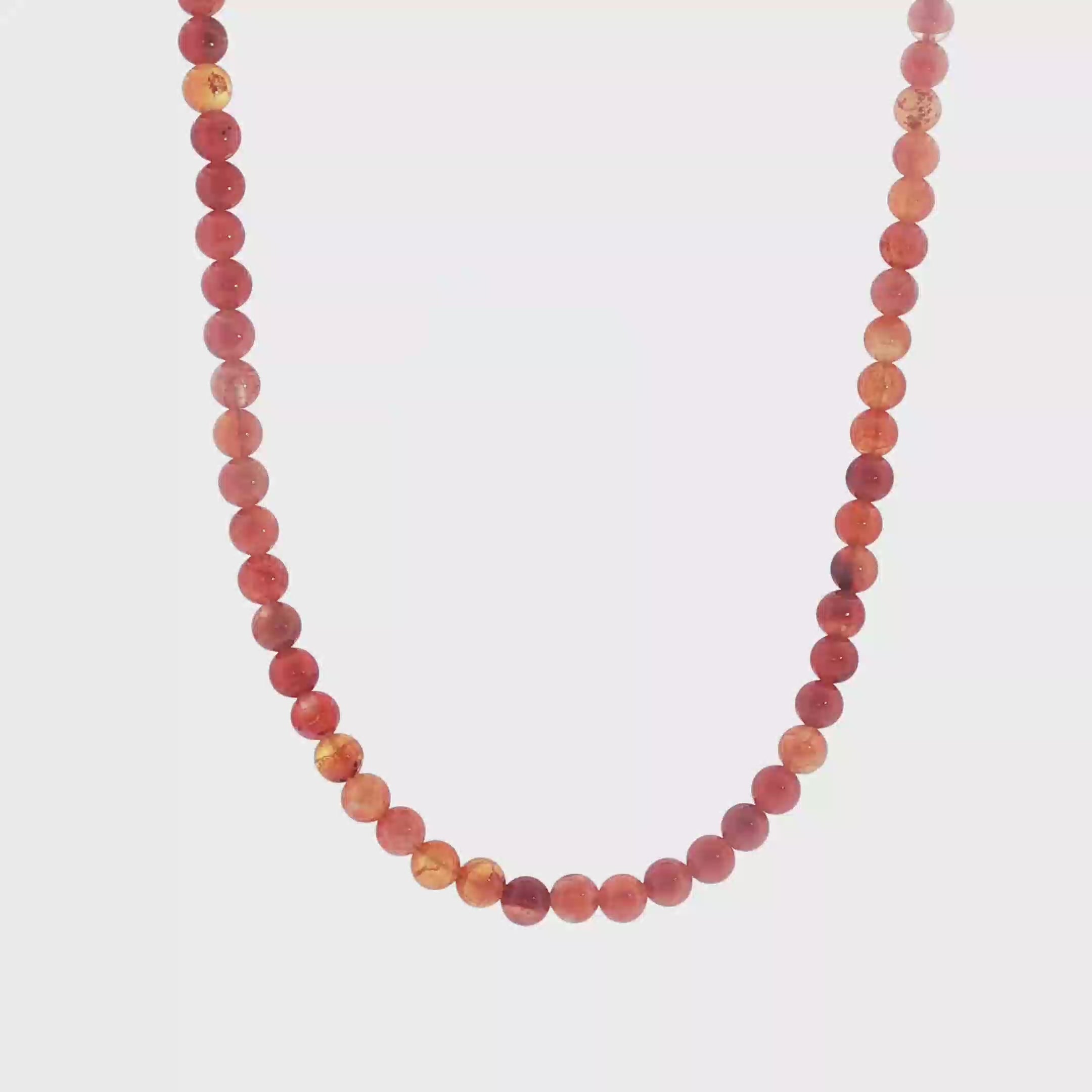 Chaque perle a été soigneusement sélectionnée pour la qualité de sa transparence, la richesse de sa couleur et la régularité de son poli. L’agate feu, réputée pour son éclat chaleureux et vivant, confère à ce collier une présence lumineuse et raffinée, idéale aussi bien au quotidien que pour des occasions plus habillées.