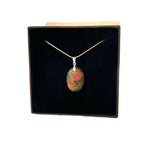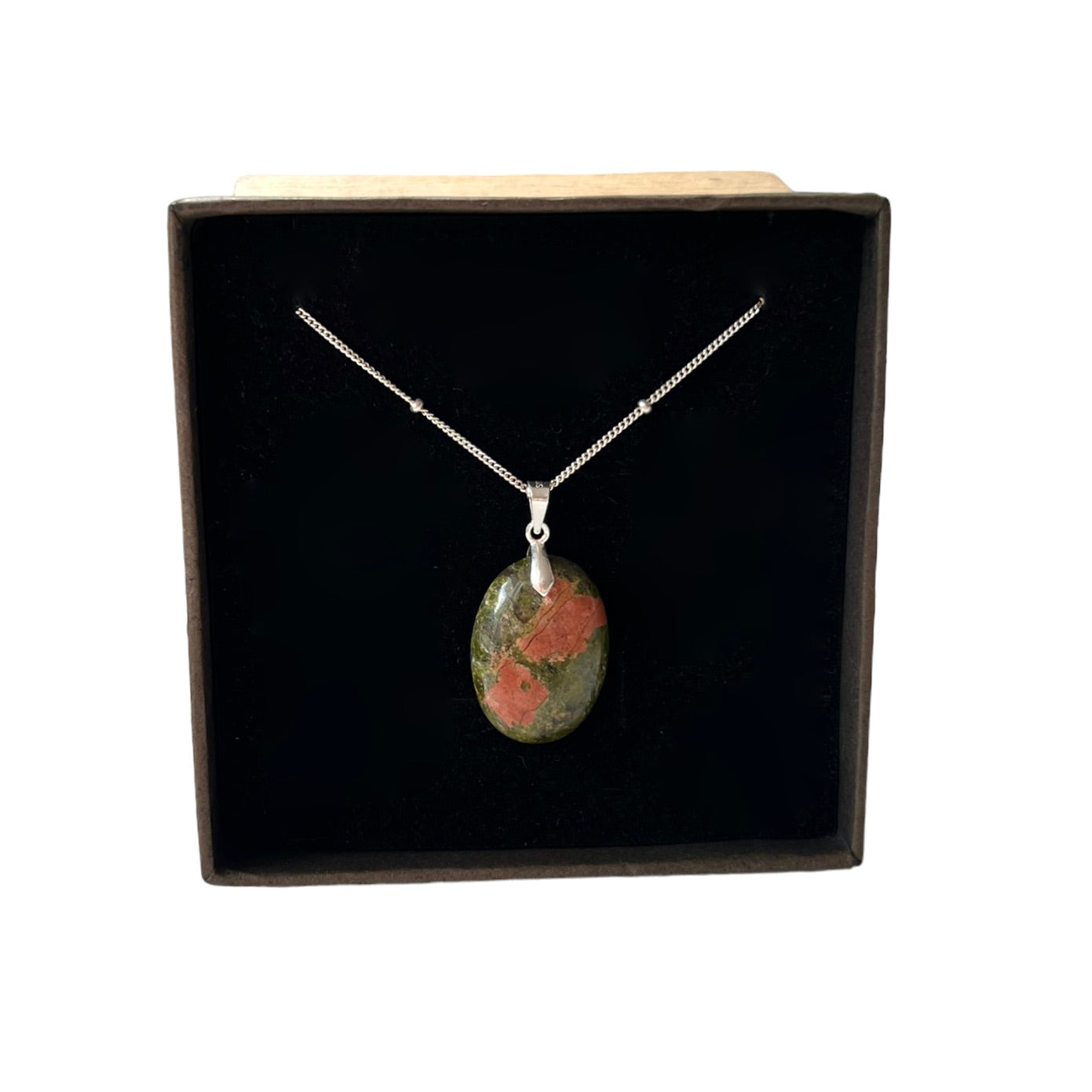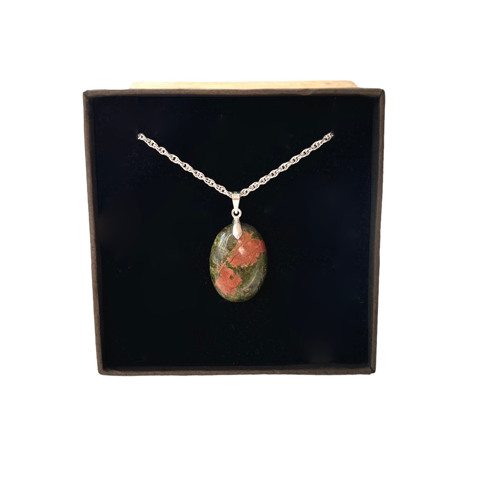 • Pendentif unakite naturelle monté sur chaine et fermoir en argent 925/1000.