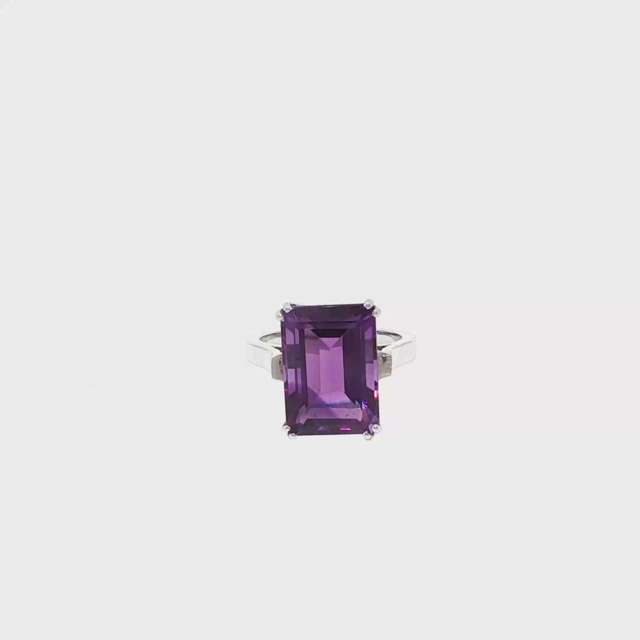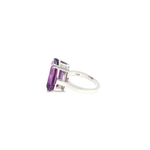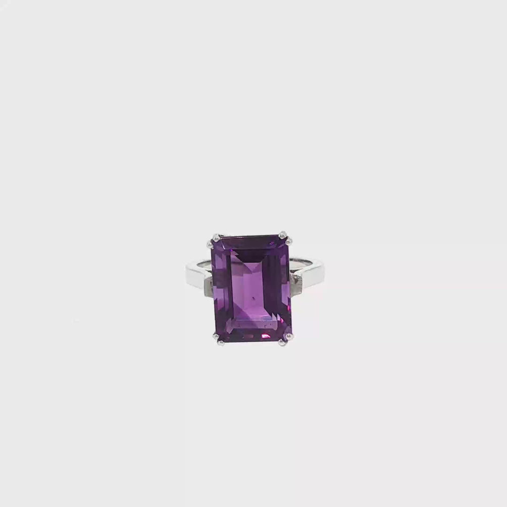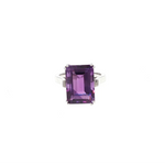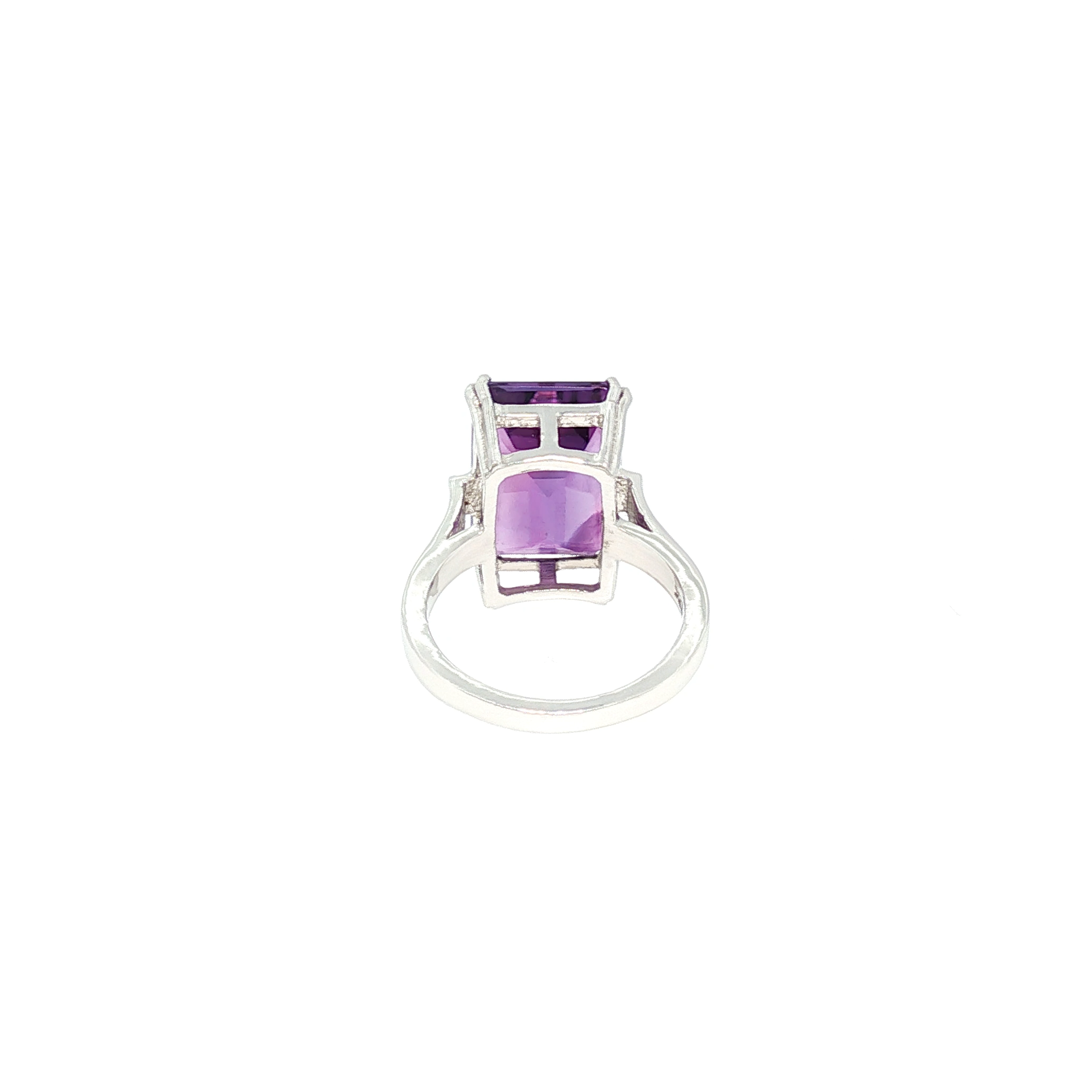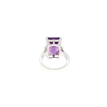Taillée en forme rectangulaire, cette améthyste offre une lecture graphique et structurée, mettant en valeur la pureté de la pierre et la précision de ses facettes. La taille rectangulaire, emblématique de la haute joaillerie, confère à la bague une allure élégante, moderne et intemporelle.