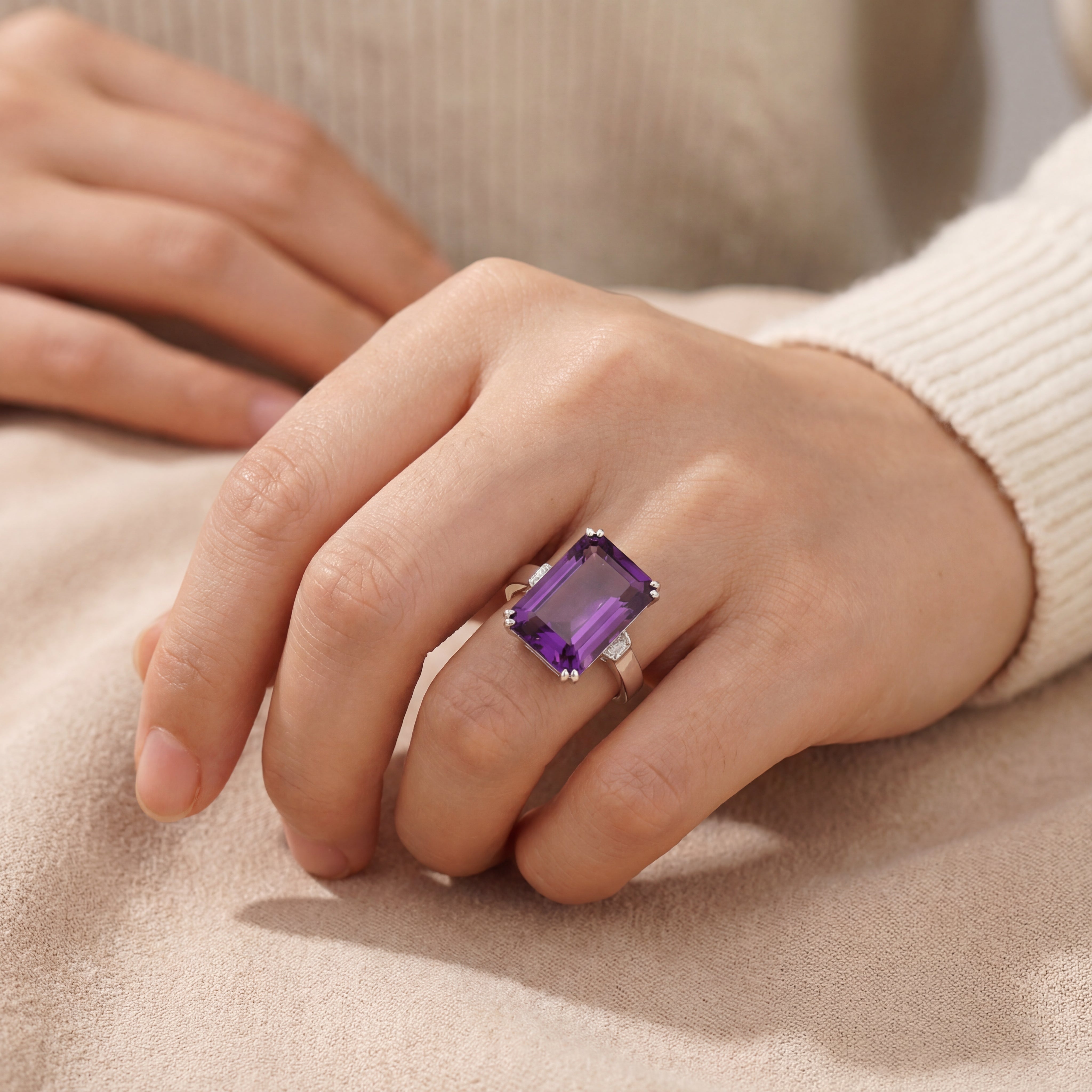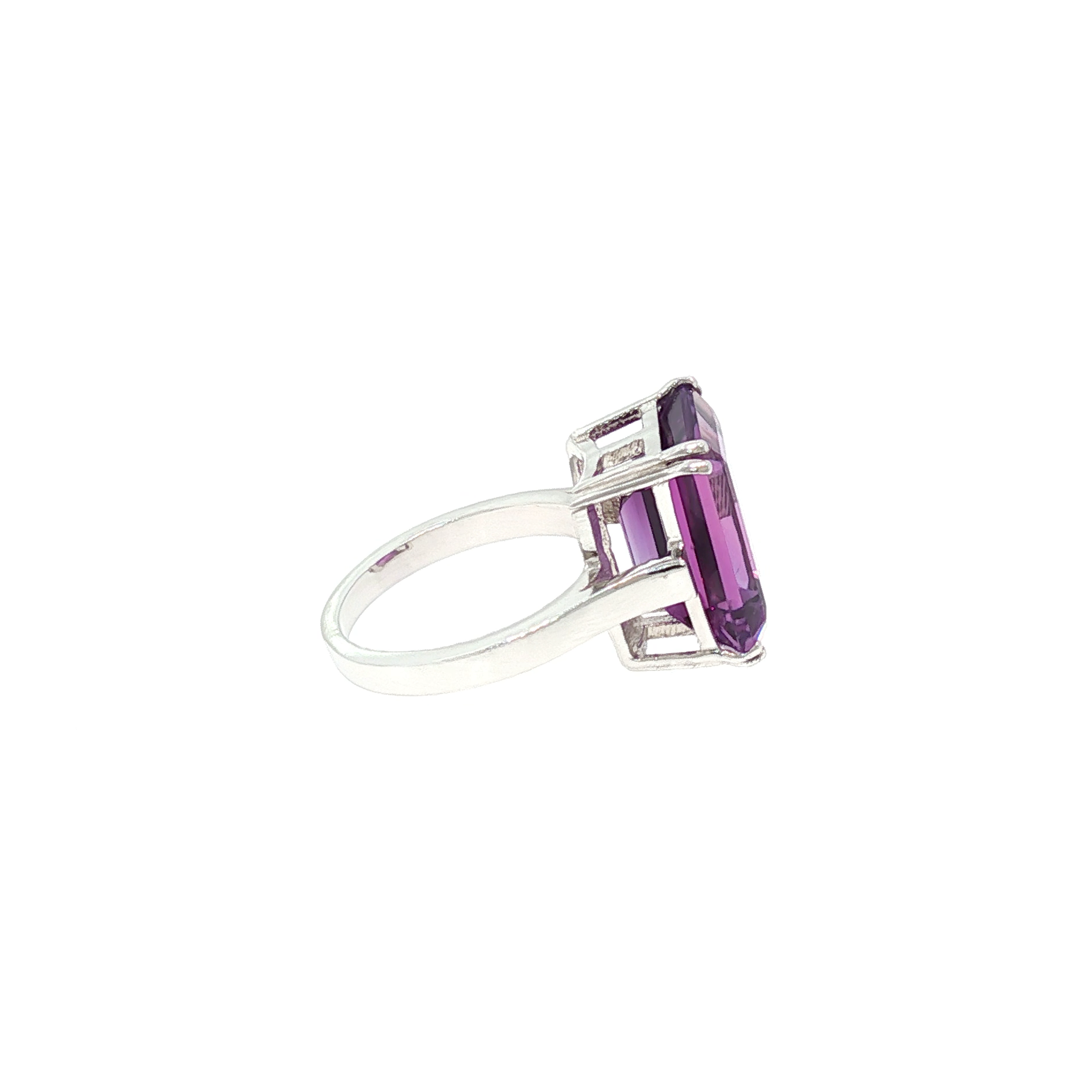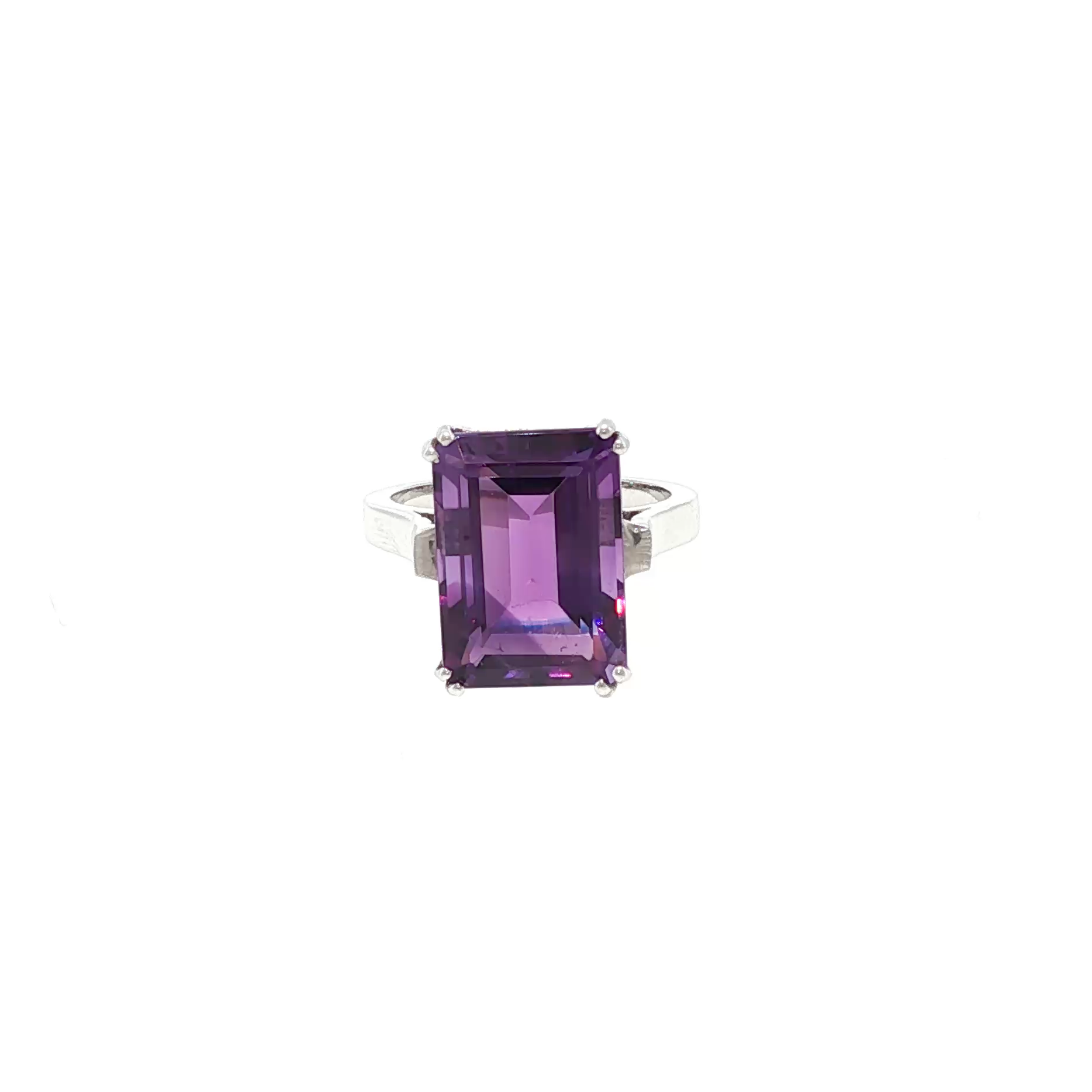 Taillée en forme rectangulaire, cette améthyste offre une lecture graphique et structurée, mettant en valeur la pureté de la pierre et la précision de ses facettes. La taille rectangulaire, emblématique de la haute joaillerie, confère à la bague une allure élégante, moderne et intemporelle.
