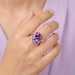 Amélys est une création artisanale au caractère affirmé, pensée pour sublimer la beauté de l’améthyste dans une interprétation résolument joaillière. Sa pierre centrale, une améthyste violette naturelle, séduit par l’intensité de sa couleur et la profondeur de ses reflets.
