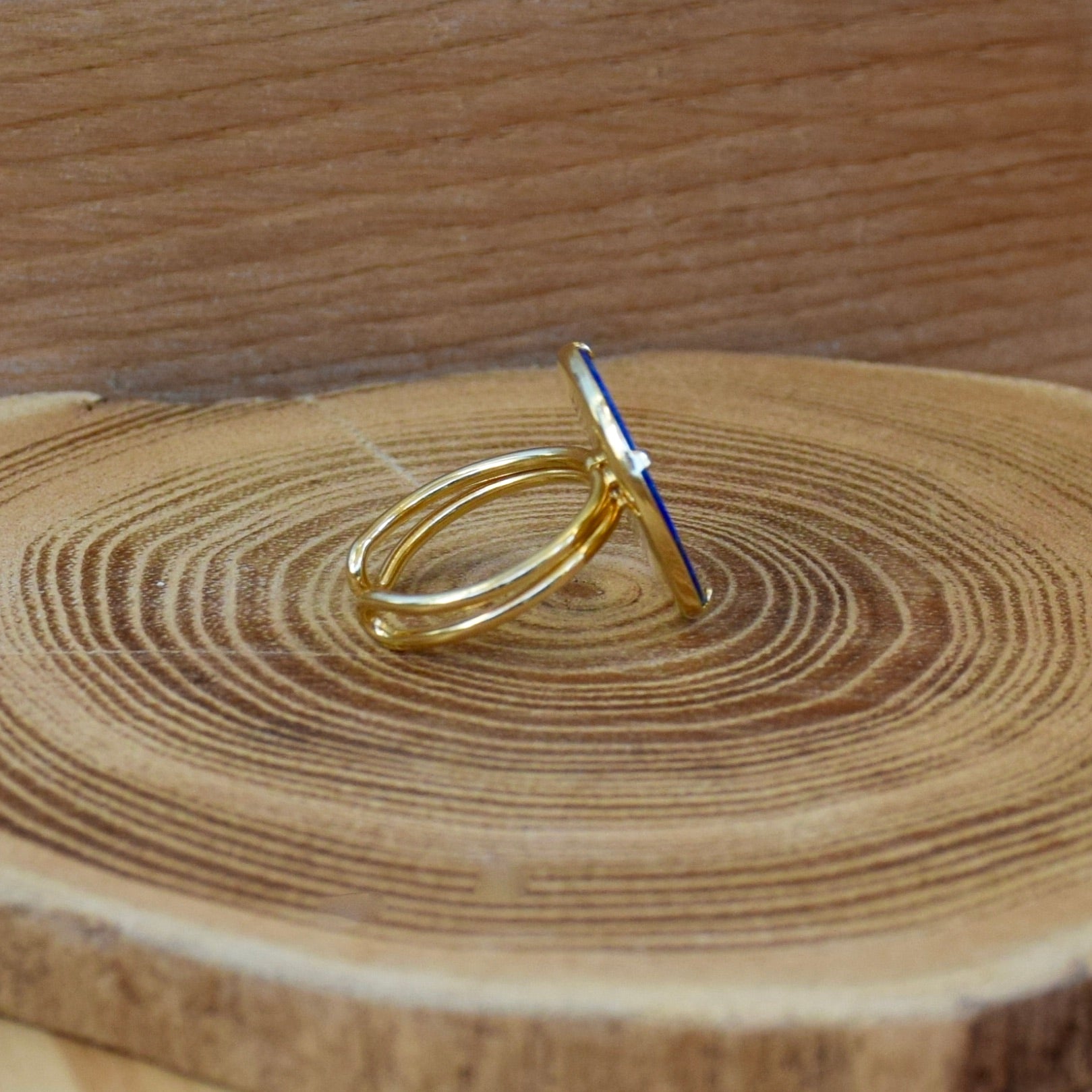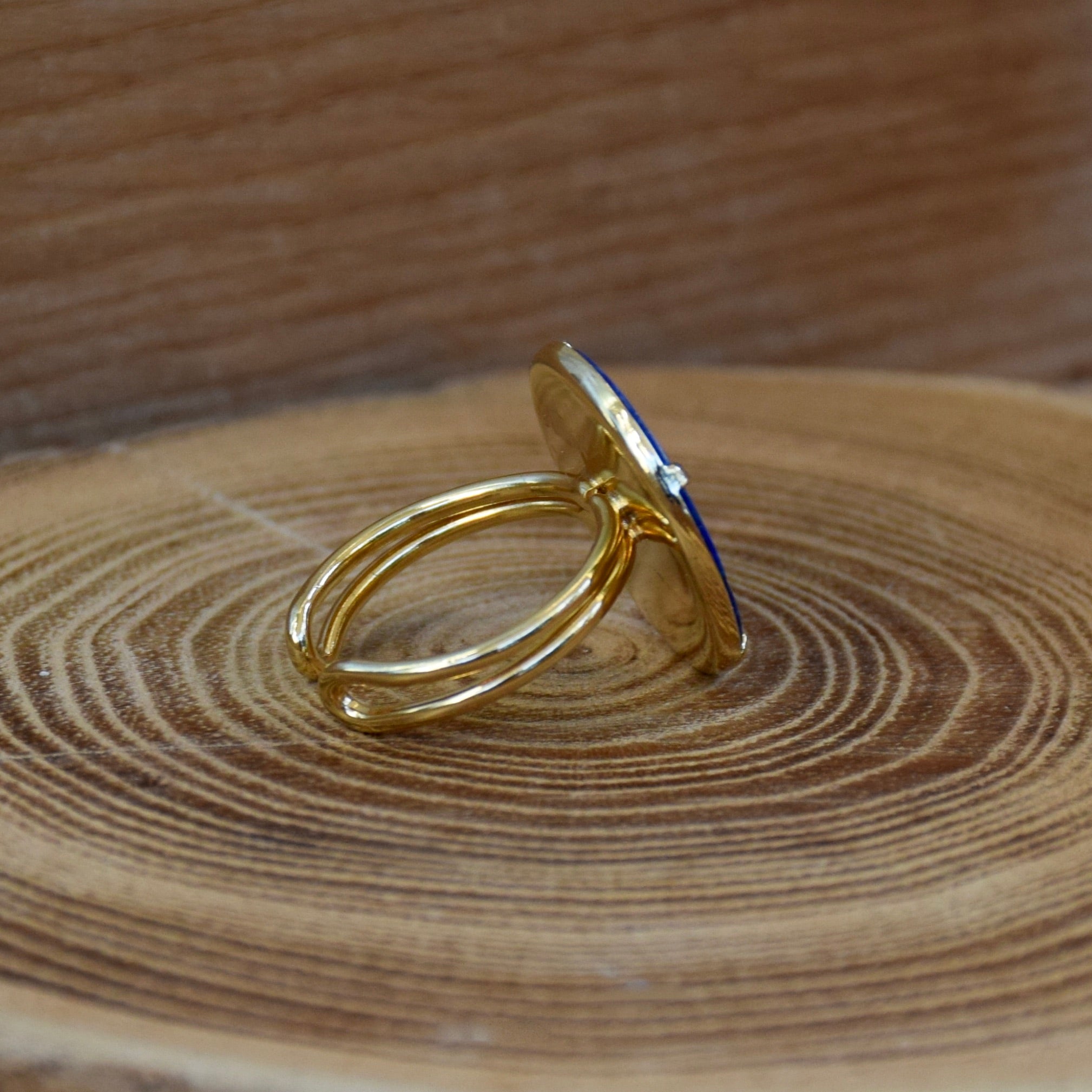 Bague plaquée or 3 microns avec lapis lazuli pierre naturelle de 20 mm de diamètre sertie de 4 griffes.