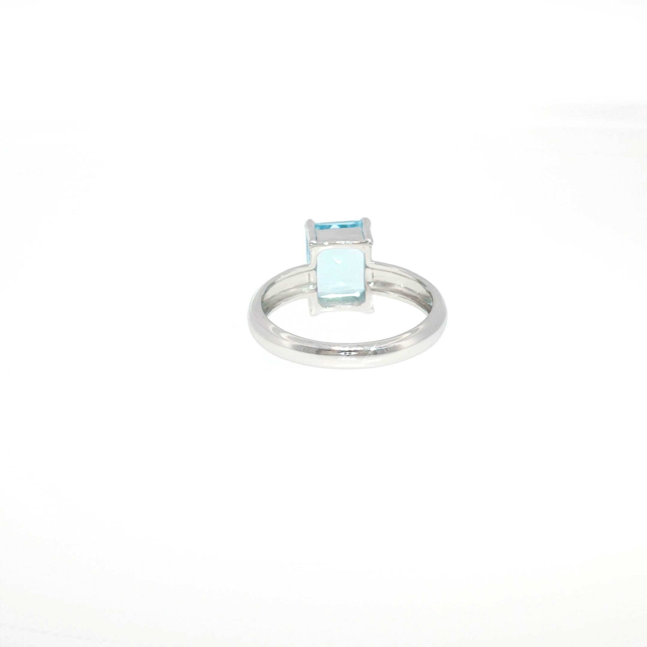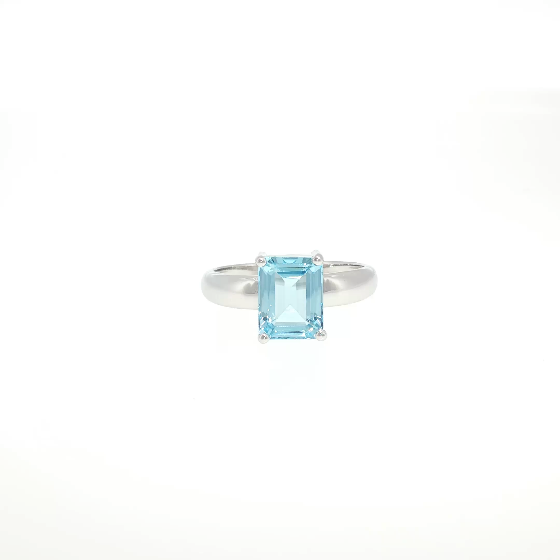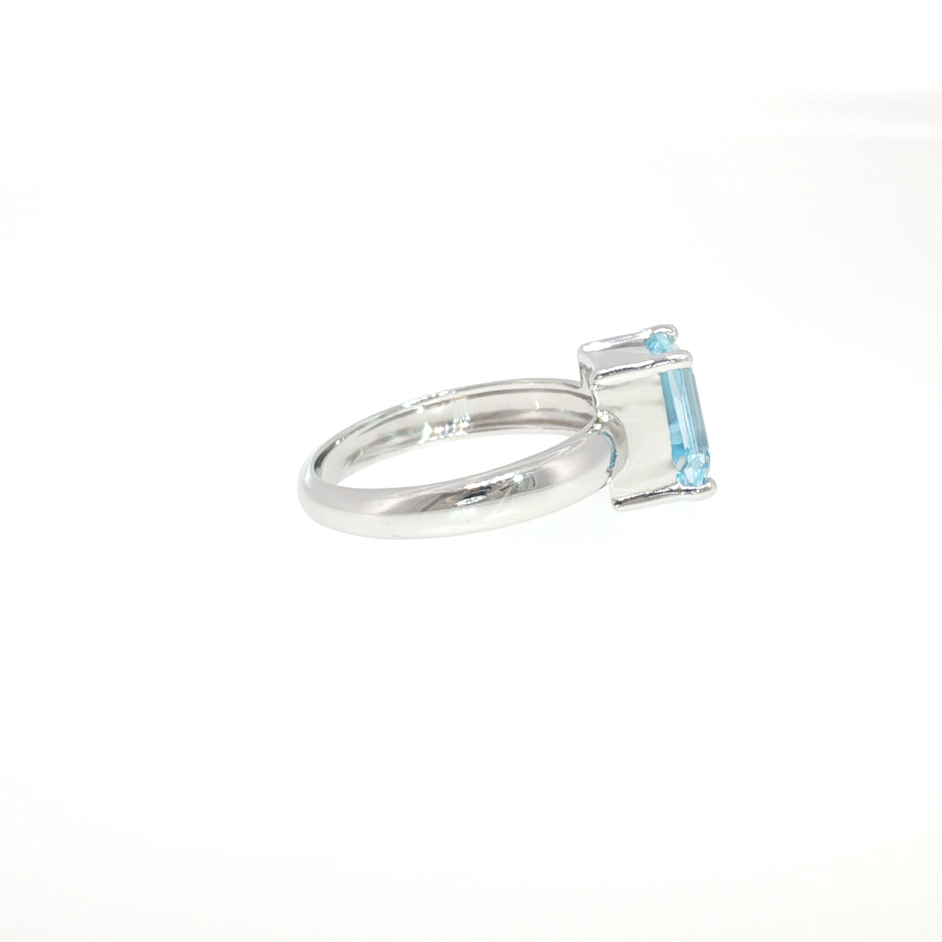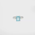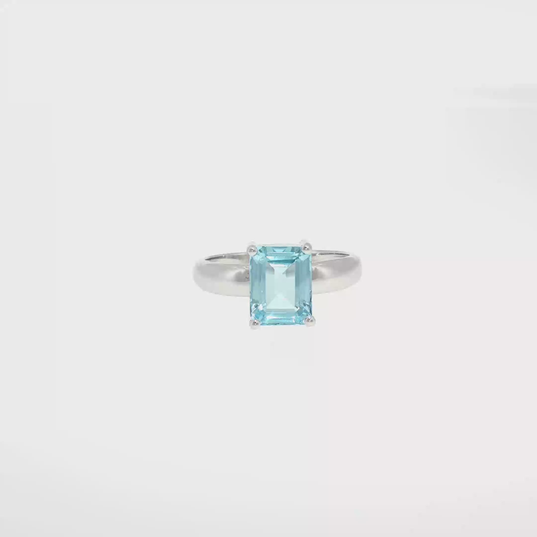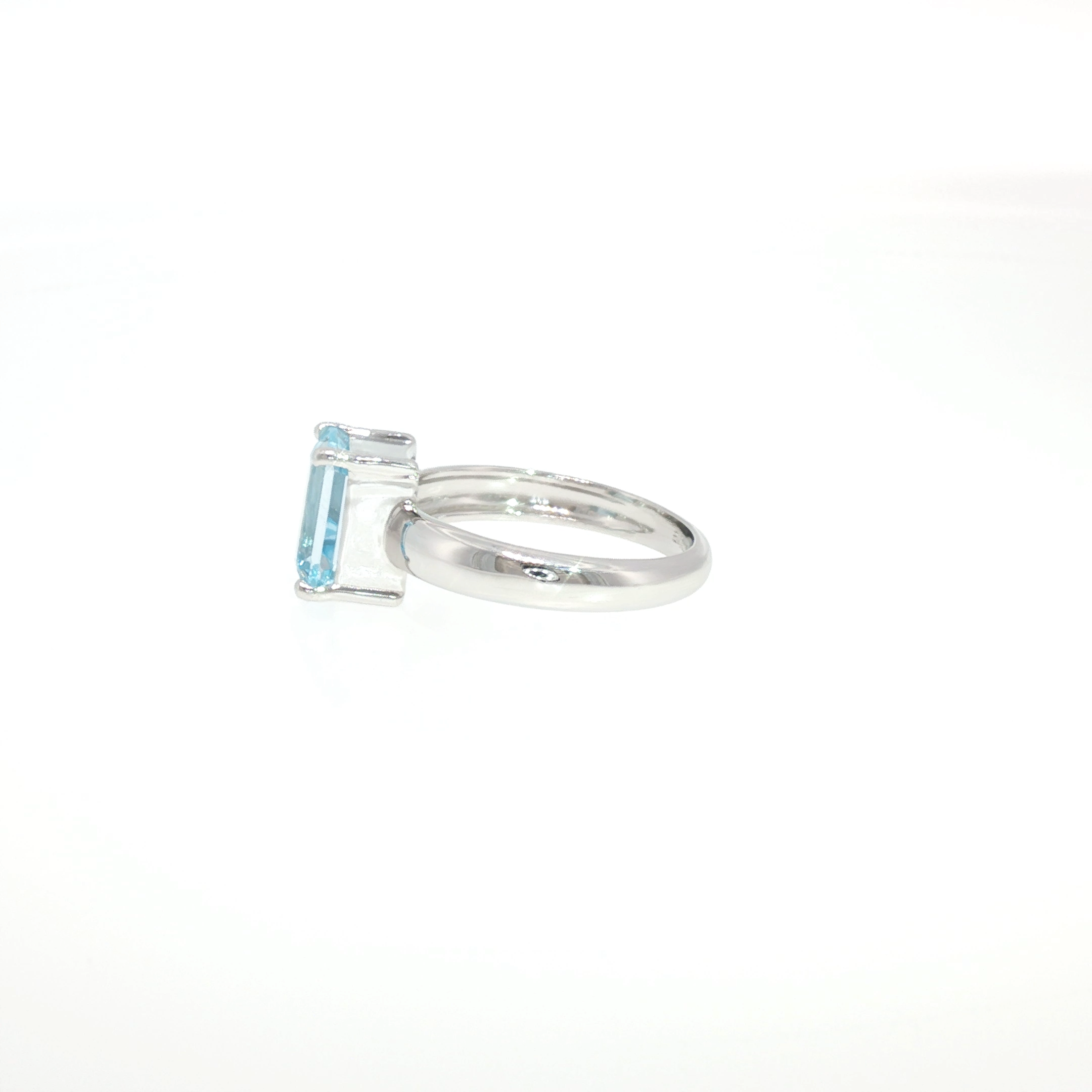 Taillée en forme carrée aux lignes nettes, la pierre révèle une brillance structurée et contemporaine, rappelant la pureté du ciel et la transparence de l’eau. Cette taille apporte à la bague une allure joaillière moderne, à la fois délicate et affirmée.